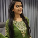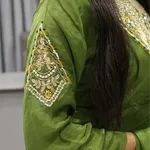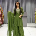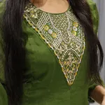 Chinon V Neck Work Short Kurti Plazzo Pair ( Mahendi)